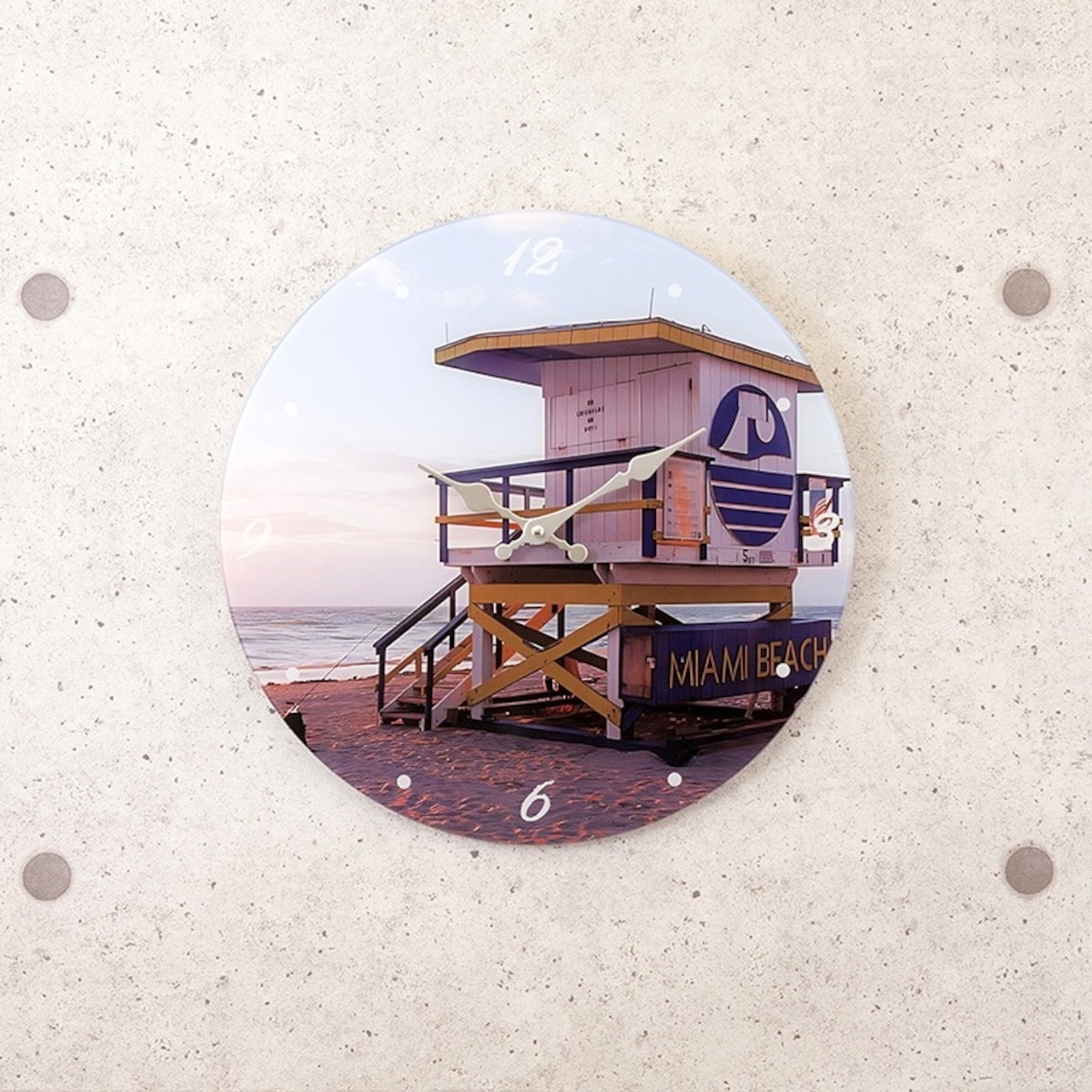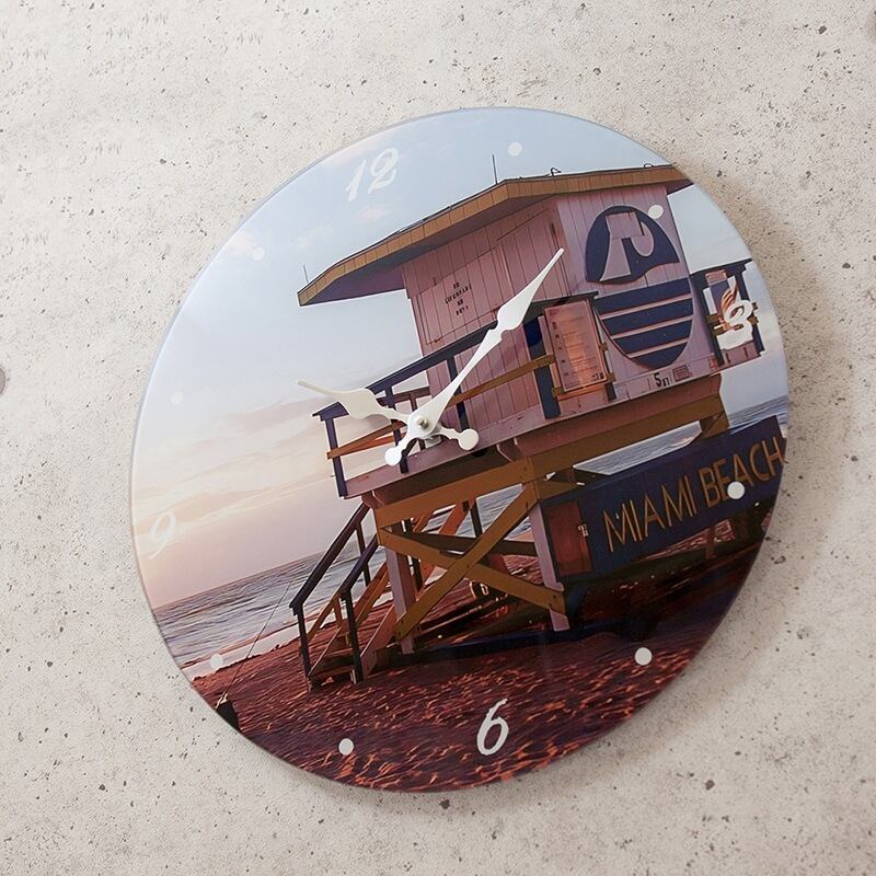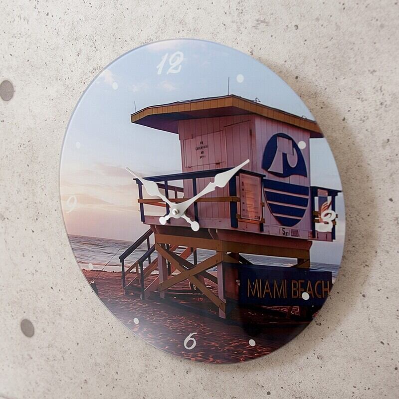 アメリカ東海岸のマイアミビーチを感じられる掛時計、ガラスウォールクロック[MIAMI BEACH Blue]です!美しい青い海と青空が印象的なデザインが、あなたのお部屋に爽やかで明るい雰囲気をもたらします。自宅や店舗で、マイアミビーチの魅力を楽しんでみませんか?