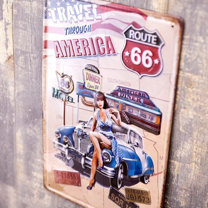 Route66をアメ車で旅するかっこいいアイアンプレートです。