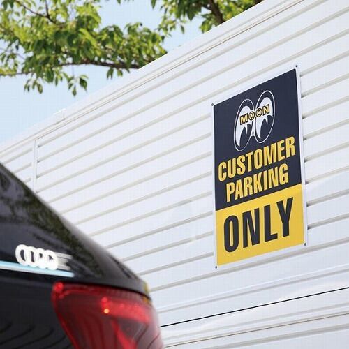 上部には MOONEYES のアイシェイプ ロゴ、そしてイエローで CUSTOMER PARKING と書かれており、下部には ONLY とブラックでハッキリ書かれていて、黒とイエローのコントラストで遠くからでも目に入ります。