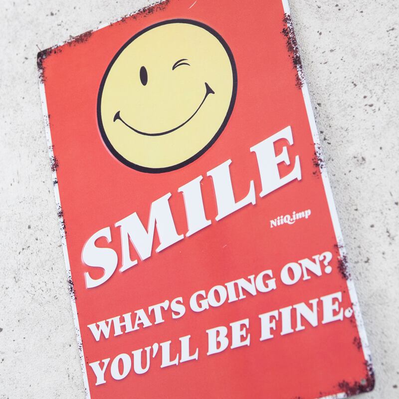 エンボス加工が施されたブリキ製のスマイルフェイスプレートです。